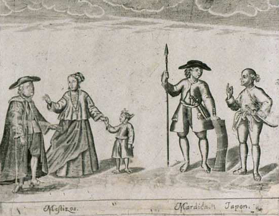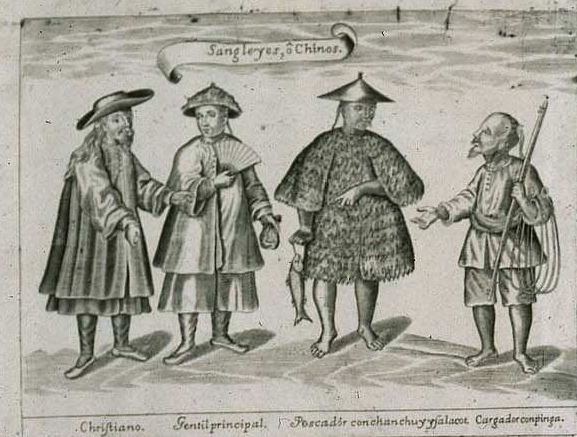 Así pues, en los bordes del mapa encontramos estos ocho grabados que representan las razas y costumbres de los habitantes de estas islas y otros cuatro con representaciones cartográficas de ciudades o islas. Debajo de cada viñeta hay pequeñas notas explicativas, al igual que las encontramos en el interior de las islas y distribuidas por el mapa. En el primero de estos grabados aparecen representados cuatro sangleyes o chinos, siendo el primero “cristiano”, el segundo “gentil principal”, el tercero un “pescador con chanchuy y salacot” y el cuarto un “cargador con pinga”.