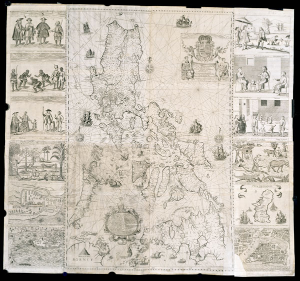 Este mapa fue encargado por Felipe II a Murillo Velarde y se trata del mapa más exacto y con más detalle de entre todos los elaborados hasta la fecha. Desde el punto de vista artístico, nos encontramos con una pieza muy delicada y original donde además de los principales accidentes geográficos aparecen representados diferentes tipos de plantas y árboles decorando el interior de las islas, e incluso lo que parecen ser arrecifes de coral. Además de los accidentes geográficos y la flora, nos encontramos diversos tipos de embarcaciones que surcan los mares alrededor de las islas de los que destacan un champán chino y varias embarcaciones de menor envergadura como las caracoas, además de galeones y un patache. Pero lo que realmente nos interesa son las viñetas que rodean el mapa, atribuidas al grabador filipino Nicolás de la Cruz Bagay, que según las palabras del propio Murillo Velarde buscaban representar lo más memorable del archipiélago: