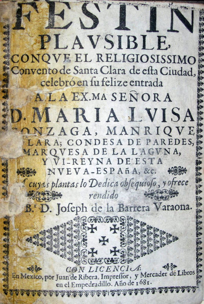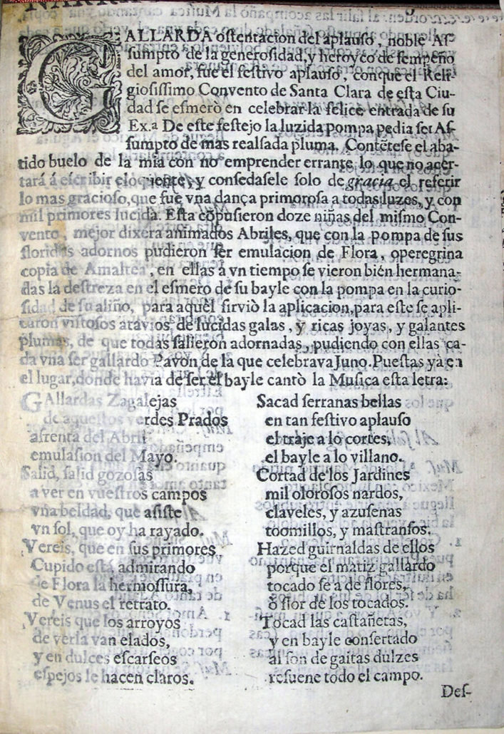 Gallarda ostentación del aplauso, noble asunto de la generosidad y heroico desempeño del amor fue el festivo aplauso conque el religiosísimo convento de Santa Clara de esta ciudad se esmeró en celebrar la felice entrada de Su Excelencia. De este festejo la lucida pompa pedía ser asunto de más realzada pluma, conténtese el abatido vuelo de la mía con no emprender errante lo que no acertará a escribir elocuente, y concédasele solo de gracia el referir lo más gracioso, que fue una danza primorosa a todas luces y con mil primores lucida. Esta compusieron doce niñas del mismo convento, mejor dijera animados abriles, que con la pompa de sus floridos adornos pudieron ser emulación de Flora o peregrina copia de Amaltea. En ellas a un tiempo se vieron bien hermanadas la destreza en el esmero de su baile con la pompa en la curiosidad de su aliño; para aquel sirvió la aplicación, para este se aplicaron vistosos atavíos de lucidas galas y ricas joyas y galantes plumas, de que todas salieron adornadas, pudiendo con ellas cada una ser gallardo pavón de la que celebraba Juno . Puestas ya en el lugar, donde había de ser el baile, cantó la Música esta letra: