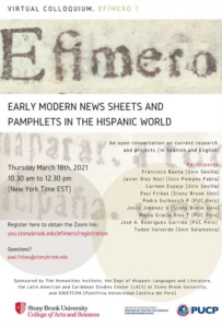 El próximo jueves 18 de marzo de 10.30 am to 12.30 pm (hora de New York) tendrá lugar el simposio virtual organizado por Paul Firbas en Stony Brook University: “Early Modern News-Sheets and Pamphlets in the Hispanic World”. Inscripciones en https://you.stonybrook.edu/efimero/registration/